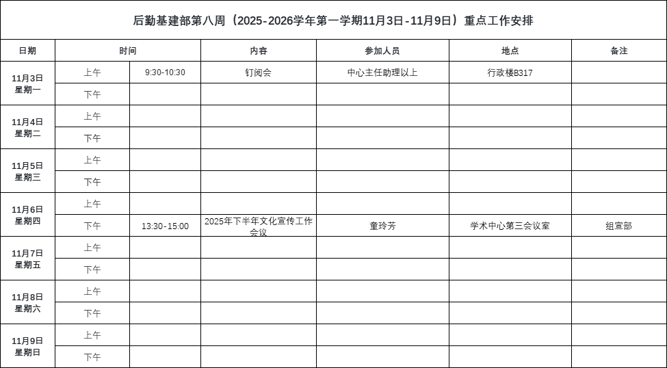 后勤基建部第八周(2025-2026学年第一学期11月3日-11月9日)重点工作安排.xlsx