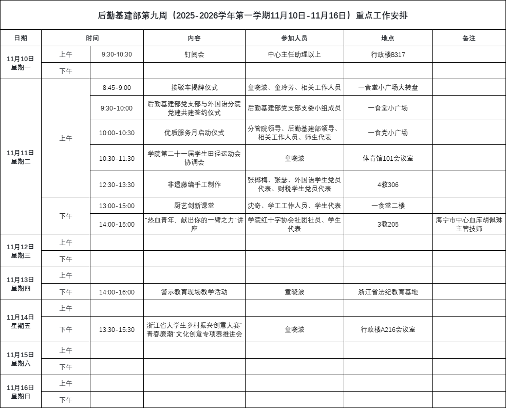 后勤基建部第九周(2025-2026学年第一学期11月10日-11月16日)重点工作安排