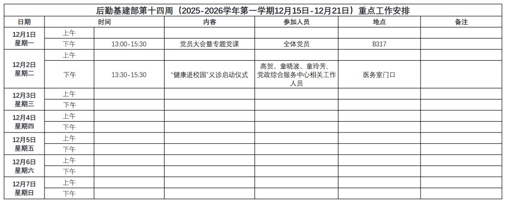 后勤基建部第十四周(2025-2026学年第一学期12月15日-12月21日)重点工作安排