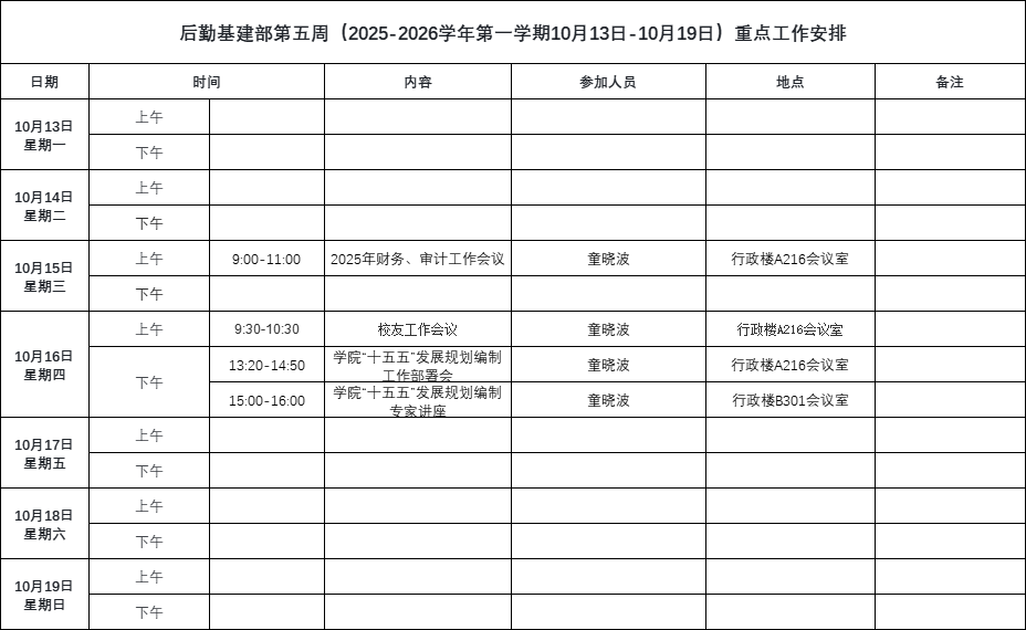 后勤基建部第五周(2025-2026学年第一学期10月13日-10月19日)重点工作安排