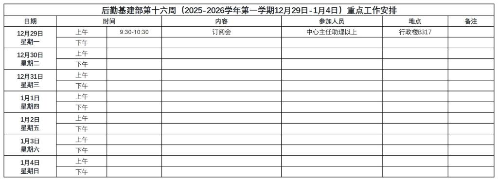 后勤基建部第十六周(2025-2026学年第一学期12月29日-1月4日)重点工作安排