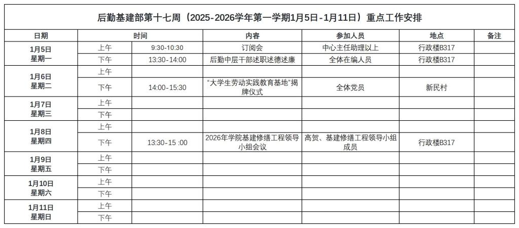 后勤基建部第十七周(2025-2026学年第一学期1月5日-1月11日)重点工作安排