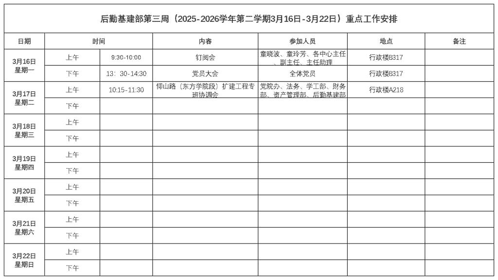 后勤基建部第三周(2025-2026学年第二学期3月16日-3月22日)重点工作安排